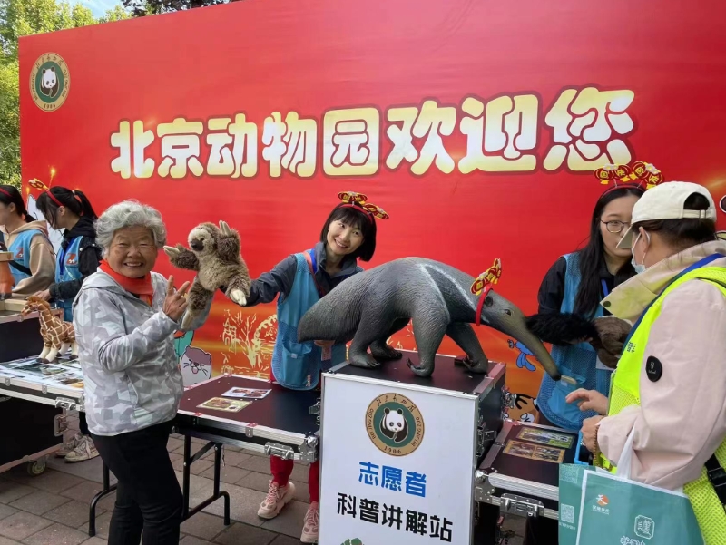 2日,北京动物园举办志愿服务主题文化活动。活动现场象犀组、草食组、美澳组、水禽组共4支公园志愿者讲解组携带模型及平板电脑等讲解道具现场为游客讲解动物知识,同时志愿者身着公园IP形象人偶装扮,在现场烘托气氛,邀请游客合影。活动充分展示公园志愿者服务站成立20周年来动物科普讲解经验,发挥全国科普教育基地职能。